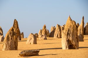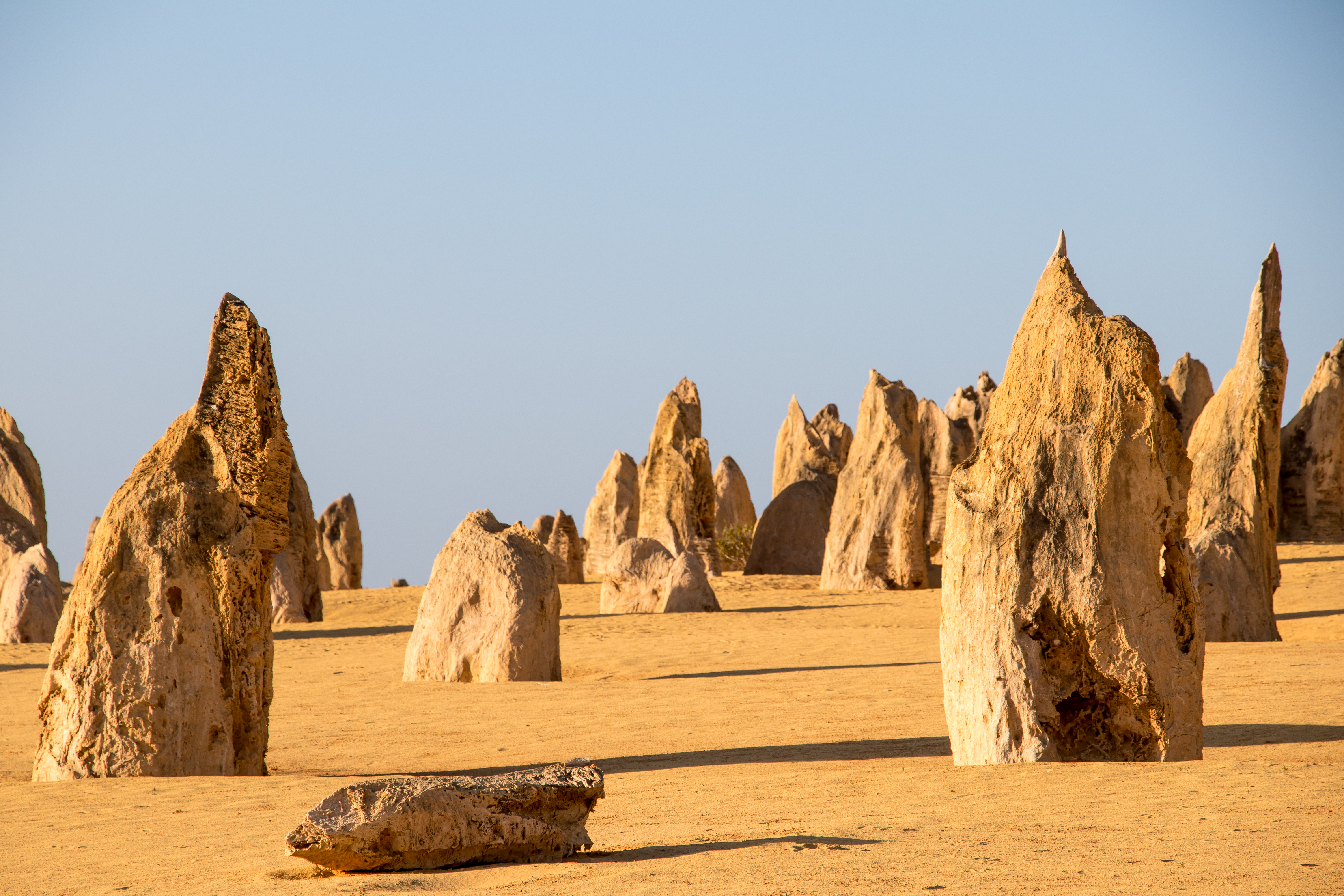 Andra mycket speciella naturfenomen på vägen såg vi vid Cervantes. The Pinnacle dessert. Hårda stenstoder som kommer upp ur sanden. Ingen vet exakt hur de uppkommit, men en trolig teori handlar om att de ursprungligen är rotsystem från träd som samlat på sig mineraler och under hårt tryck och miljontals år har blivit hårdare är kalkstenen omkring.